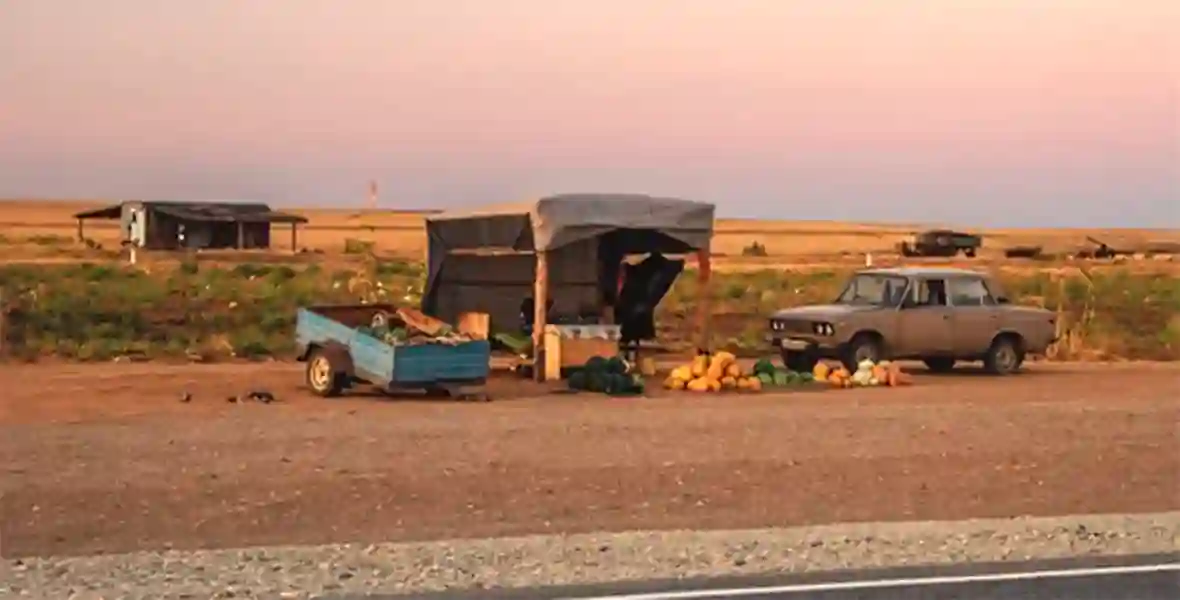 Близ Астрахани много дорожной полиции, дальше взамен настоящих патрулей — картонные муляжи, а в степях пропадают и они. Только небо, только ветер шумно охаживает кузов.